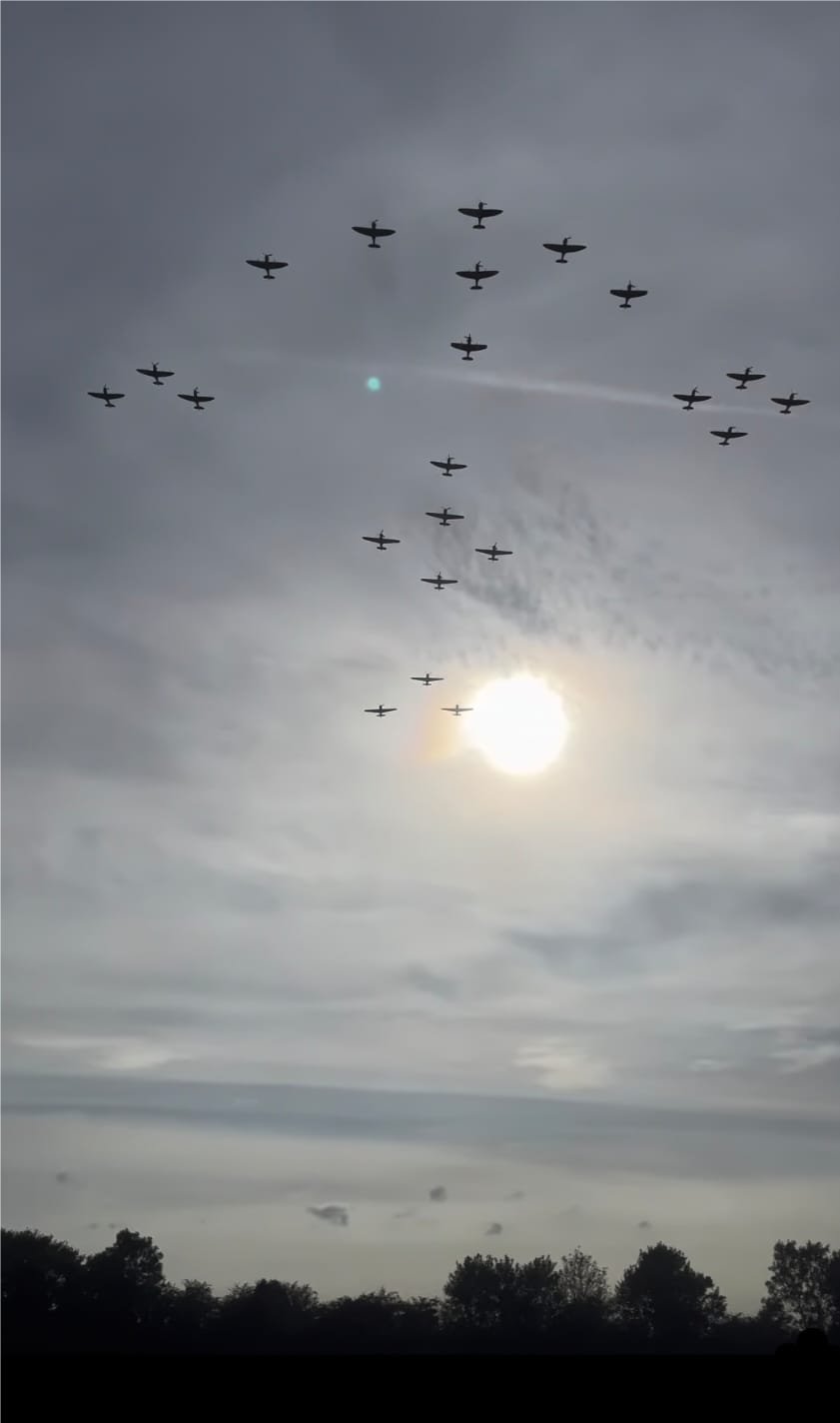 Spitfires in formation over Dernford from the Battle of Britain airshow at Duxford
